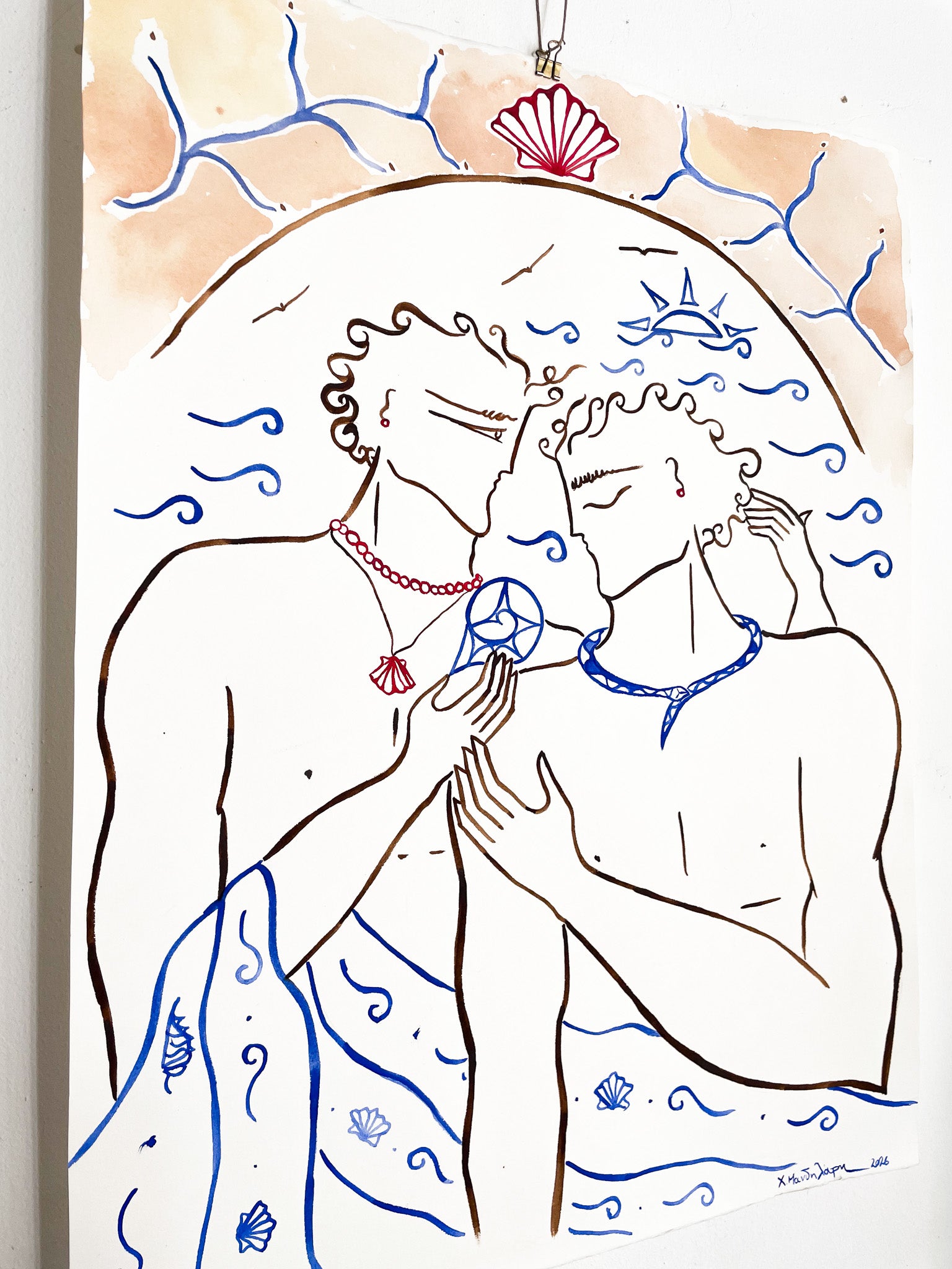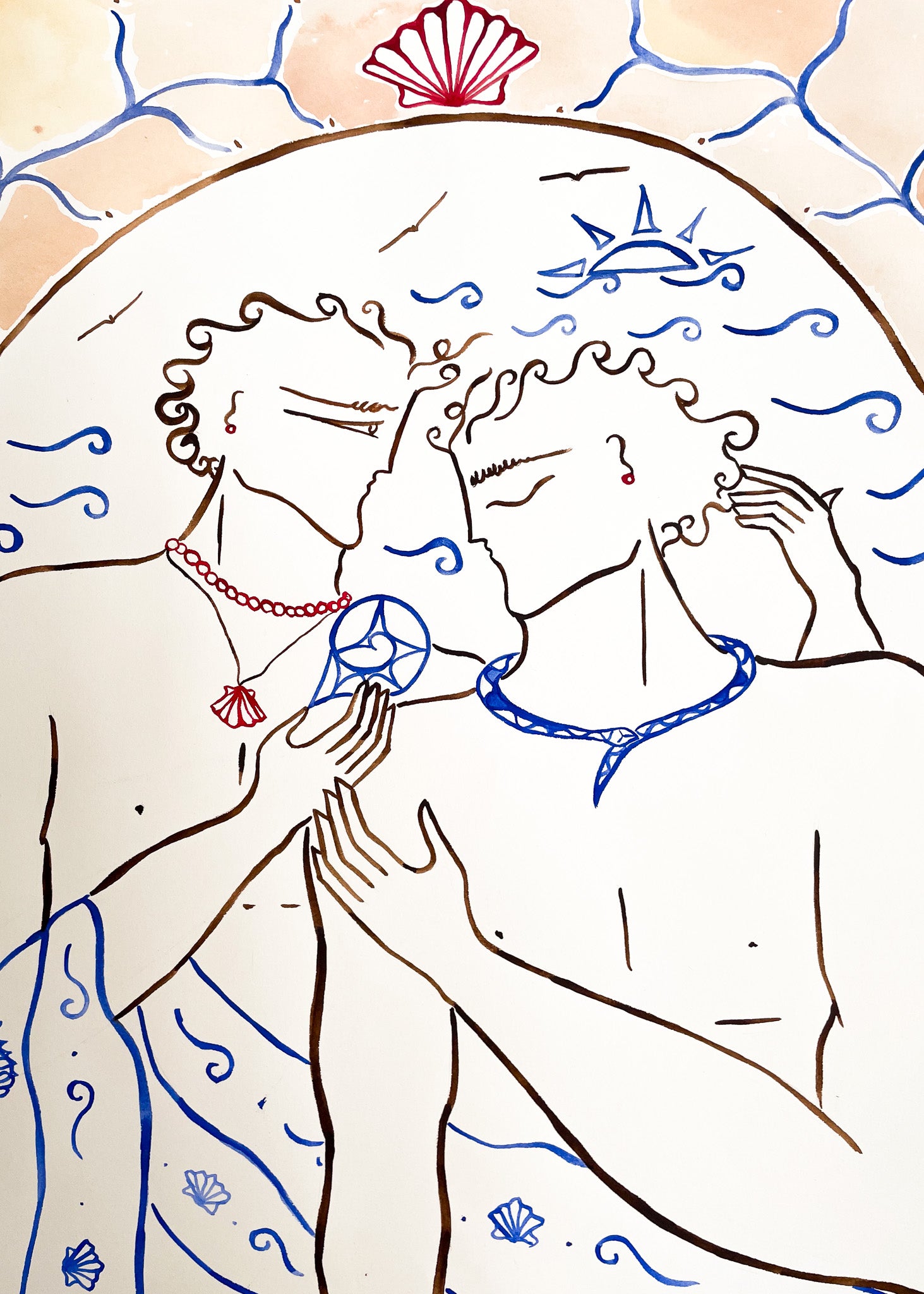 The sound of the crushing waves and the seagulls’ song fill the air at sunset. Moments before dusk, two lovers enjoy the view from their balcony.  Their skin still carries the sea. The one is holding a nautilus shell, a token from the day they have spent together. Its shell echoes the beat of the waves, the beat of their heart.
